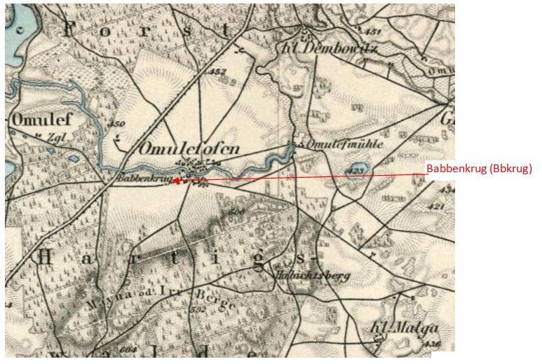 Z miejscowością Omulefofen (obecnie Kot) ściśle związane były majątki Omulef, Omulefmühle (obecnie leśnictwo Dębowiec), Leśnictwo Omulef oraz osada Babakrug. Zachowane źrodła historyczne mówią właśnie o tych składowych gminy Omulefofen. Jak podaje Max Mayhofer [Max Mayhofer „Die Landegemeinden des Kreises Neidenburg „-1968] najwcześniejszym dokumentem mówiącym o pierwszych osadnikach jest informacja, że książę Brandenburgii Georg Wilhelm zapisał w roku 1623 zajazd zwany Babakrug niejakiemu Johannesowi Plagga. Zajazd Babarug znajdowł się na szlaku transportowym pomiędzy istniejącymi już osadami Nidzica i Jedwabno w pobliżu rzeki Omulew. Jego położenie obrazuje poniższa mapka. Pierwotna nazwa tego zajazdu to Omulefscher Babbenkrug przemianowany w roku 1785 na Babben, aby następnie w roku 1820 zmienić nazwę na Babakrug. Znajdował się tu wtedy jeden dom (Feuerstelle/dym), który zamieszkiwało 13 osób [źródło: Topographische Übersicht des Verwaltungs-Bezirks des Königluchen Preußischen Regierung zu Königsberg in Preußen 1820, Str. 232, Nr.32]. Organizacyjnie należał on do majątku Omulef, a mieszkali w nim pracownicy wraz z rodzinami obsługujący majątek.