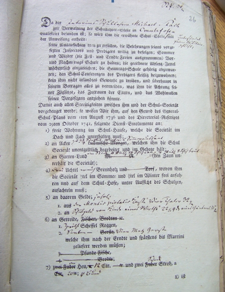 Z dokumentu tego [źródło: Archiwum Państwowe w Olsztynie. ”Königliche Regierung zu Königsberg. Abteilung für das Kirche-und Schulwesen. Acta für Omulefofen“] wynikają warunki „pracy i płacy” dla nauczyciela. Jest tu mowa o wynagrodzeniu pieniężnym, ale takż ewynagrodzeniu w naturze - w formie dostarczania opału, płodów rolnych i nieodpłatnym udostępnieniu pola i ogrodu. Poza tym zapisano tu wytyczne, jak nauczyciel powinien się zachowywać i konsekwencje tego, gdy nie będzie spełniać oczekiwań przełożonych. Interesujące jest stwierdzenie końcowe tego dokumentu: