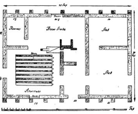 Największe pomieszczenie, w którym stoją ławki, to pomieszczenie klasowe a jednocześnie pomieszczenie mieszkalne nauczyciela. Oznaczone na rysunku pomieszczenie Kammer to prywatna część obiektu. Pomieszczenia opisane przez Stal to obora dla inwentarza należącego do nauczyciela.