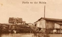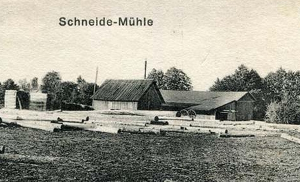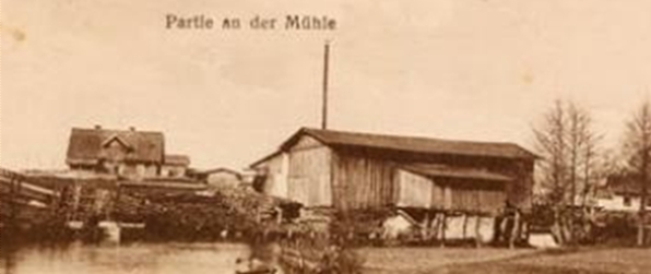 Das im Hintergrund sichtbare Wohngebäude ist das Haus des Besitzers des Sägewerks, der ein Lehrer war und Lange hieß. Vor ihm gehörte das Werk dem H. Paulini, einem Bruder des Mühlenbesitzers aus Omulefmühle (Przysowy). Nähere Informationen zum Betrieb des Sägewerks finden Sie in dem Teil 'Geschichte' beim Thema 'Wissen Sie das ...'.