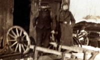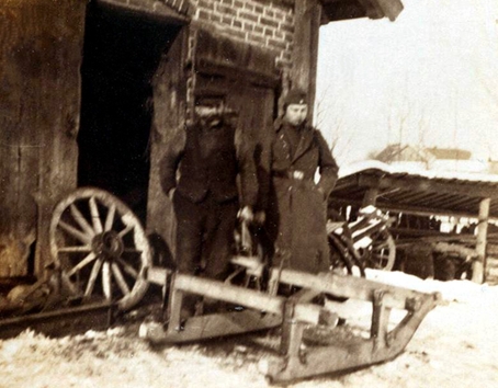 Das Foto unten zeigt den Vorkriegsbesitzer vor dem Hintergrund der Werkstatt. Das Schild, das auf dem Foto zu sehen ist, zeigt an, dass die Haupttätigkeit des Tischlers die Produktion von Särgen war. Die Verarbeitungskapazität dieser Anlage entsprach den diesbezüglichen Anforderungen für das gesamte Gebiet. Neben Särgen wurden hier auch Fenster, Türen und sogar Küchenmöbel (Tische, Schränke, Stühle) hergestellt.